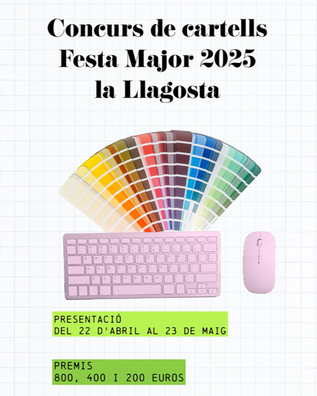 L’Ajuntament de la Llagosta ha convocat el Concurs de cartells de la Festa Major del 2025. La participació és oberta tant a professionals com a artistes novells majors de 16 anys. Les persones participants poden presentar un màxim de dos dissenys, que han de ser originals i inèdits. Cal incloure les frases Festa Major de la Llagosta 2025 i De l’11 al 14 de setembre. A més, cal preveure la inserció de l’escut de l’Ajuntament de la Llagosta o reservar un espai.
